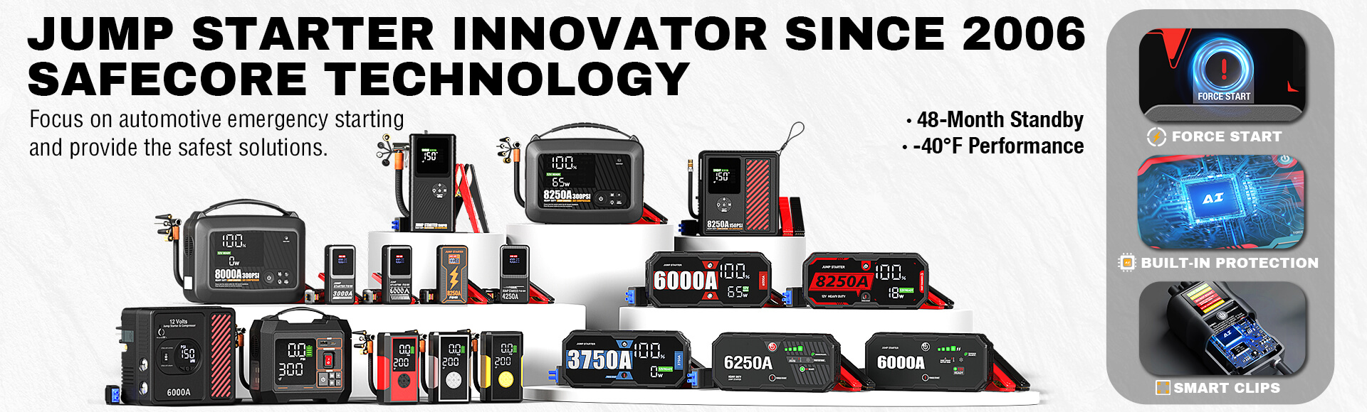 Advanced Product Features: Including force start jump starter technology, backfeed prevention, and multi-protection safety systems.